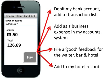 This slide was one of many slides Ewan Macleod used in his presentation to describe how he would like to be able to use his mobile to give him a seemless experience. This slide shows what could happen when you pay for a meal at a business meeting in a hotel.
